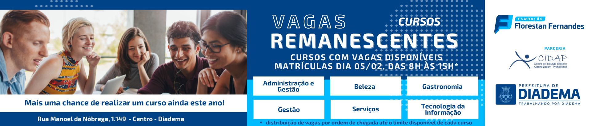 Primeiramente, o candidato precisa comprovar residência em Diadema. Os cursos e oficinas, por força de Lei, são exclusivos dos munícipes. O processo para conseguir uma das vagas consiste em aguardar a publicação de Edital em nosso site. Atualmente lançamos dois por ano, geralmente em janeiro e junho. No Edital a Florestan informa os cursos, o(s) dia(s) e horário(s) da semana em que os cursos são realizados, o número de vagas e a escolaridade mínima. É estipulado um período de matrícula no qual um link para inscrições on-line fica disponível. Ao final da inscrição o candidato recebe um protocolo. Essa inscrição, no entanto, não garante a vaga: ela só é efetuada quando o candidato comparecer posteriormente (em data informada no Edital), com a documentação necessária para tentar uma das vagas. Como as vagas são limitadas, a Florestan reserva o direito de distribuir senhas por ordem de chegada.